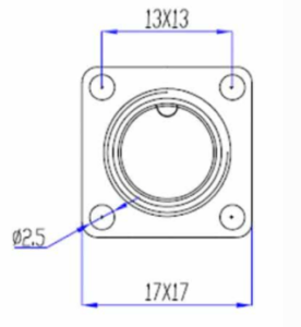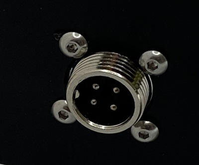 The male end connector has an integral flange with 4 holes for mounting which require M2.5 screws or rivets. The connector must be fitted from behind with the threaded section protruding through the panel and will require a 14mm hole with a step drill usually the preferred tool for this. Insert the main part through the hole and then use a 2.5mm drill through the 4 mounting holes in the flange to drill the holes and fix the flanged end in place.